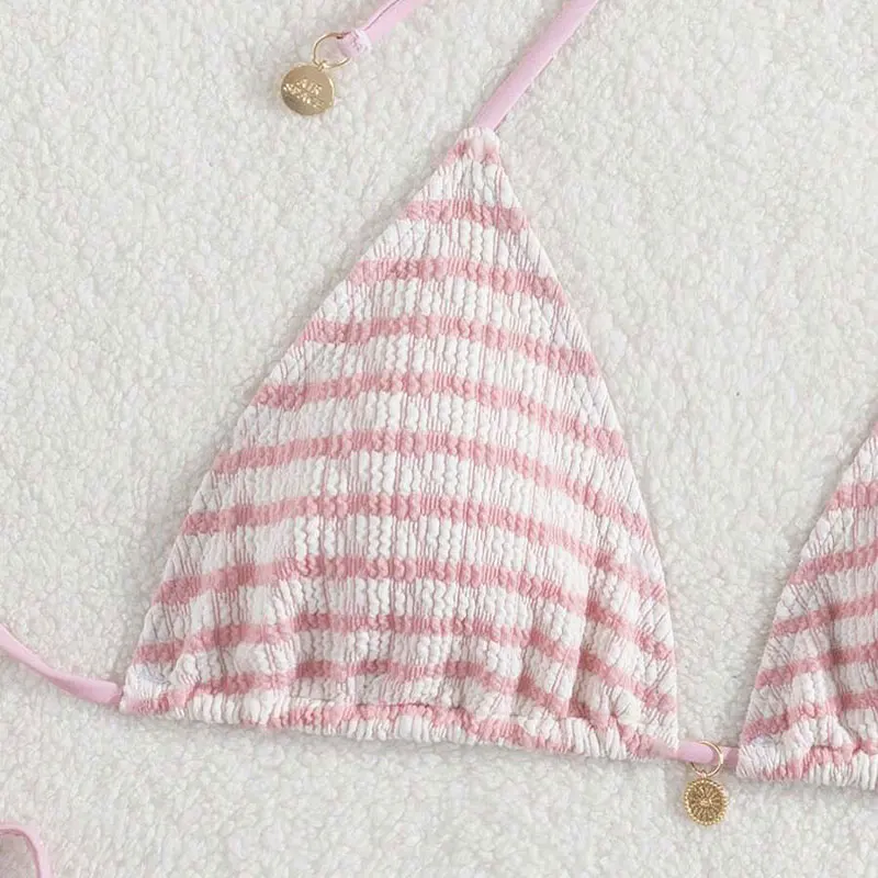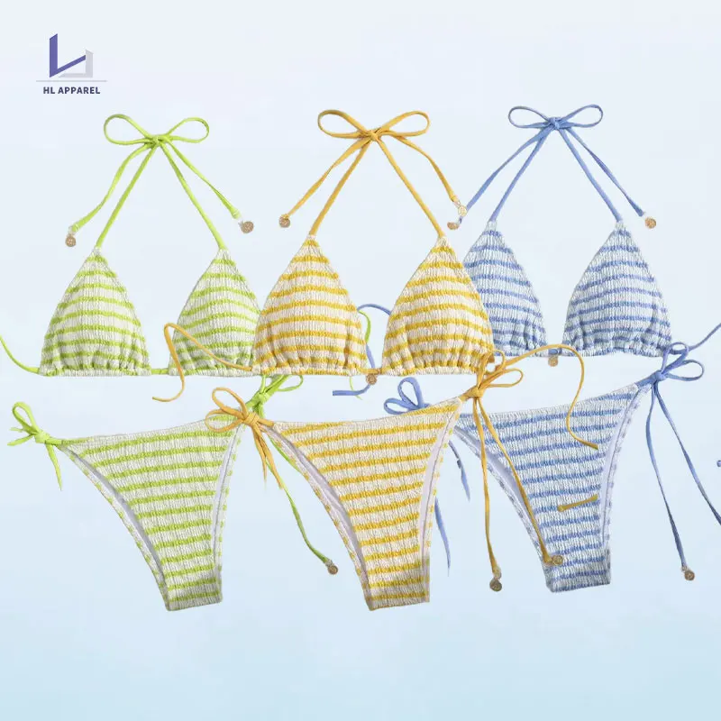 Huili Manufacturer Swimsuits Two Piece Beachwear Custom logo Triangle Striped Water Ripple Halter Tie Side Bikini Set for Women